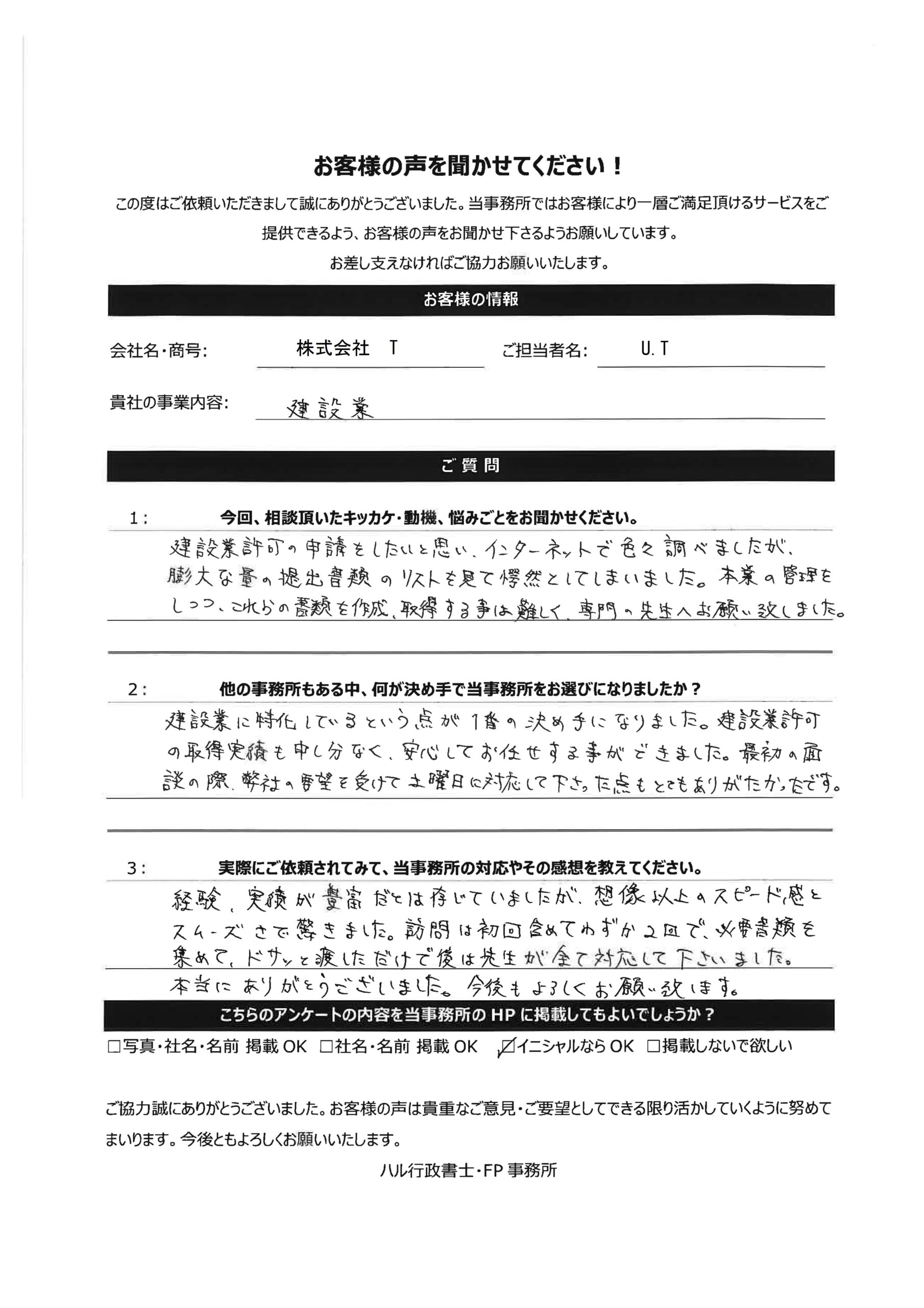 数ある事務所の中から、当事務所が「建設業に詳しい」との評価をお聞きになり、お選びいただいたとのことです。